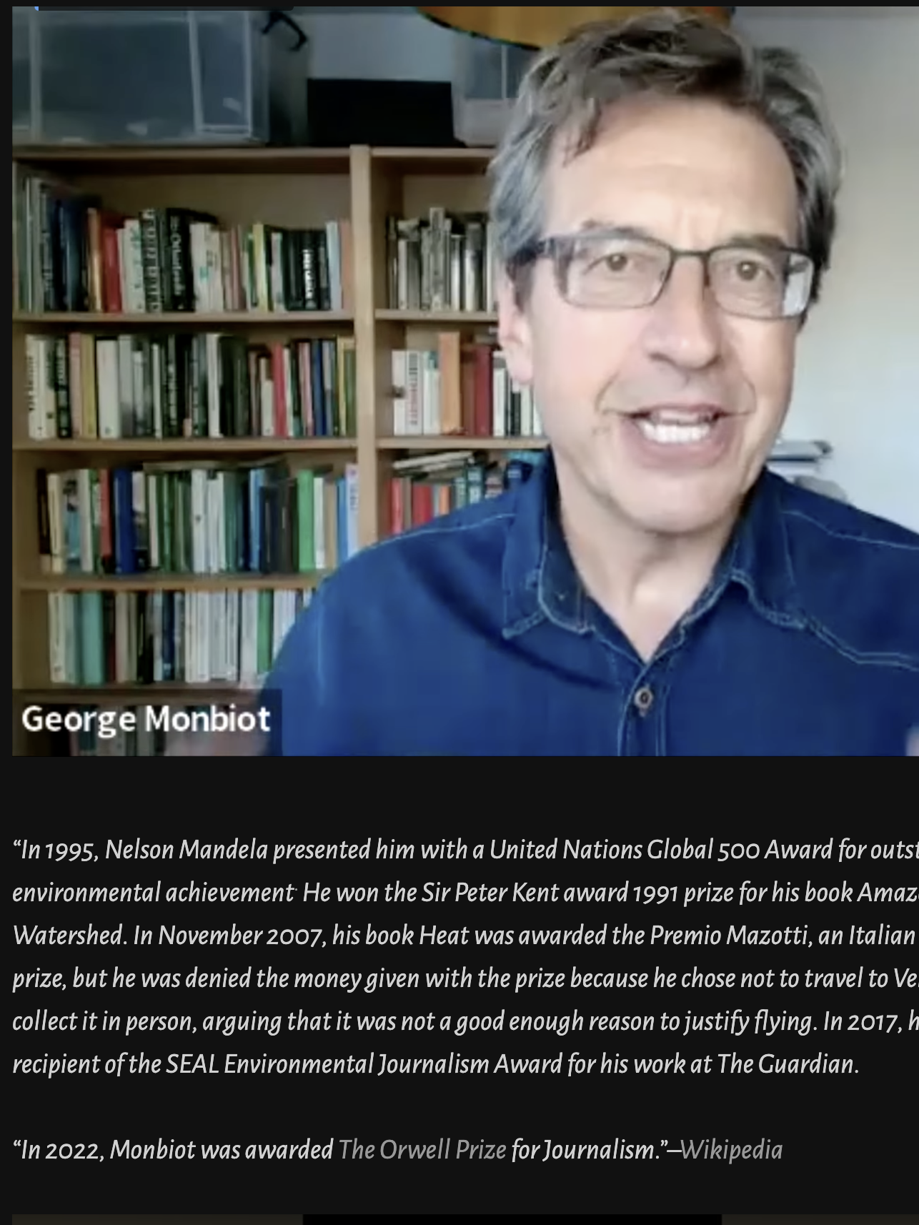“In 2022, Monbiot was awarded The Orwell Prize for Journalism.”–Wikipedia