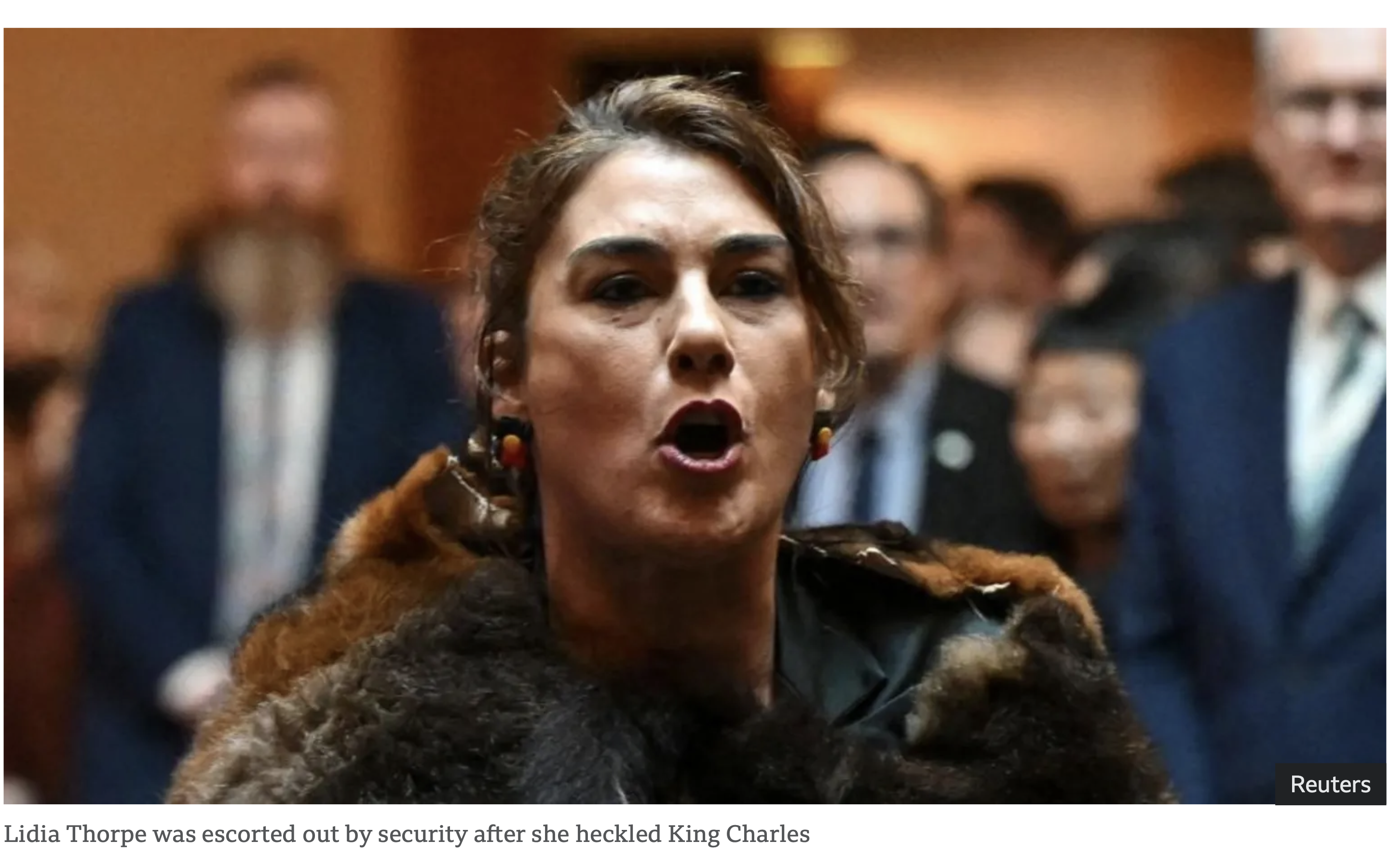 Why an Australian senator heckled King Charles | BBC | Katy Watson (22 October 2024). “I wanted to send a clear message to the King of England that he’s not the King of this country, he’s not my king, he’s not sovereign. To be sovereign you have to be of this land. He’s not of this land. How can he stand up there and say he’s the King of our country—he’s stolen so much wealth from our people and from our land and he needs to give that back. And he needs to entertain a conversation for a peace treaty in this country. We can lead that, we can do that—we can be a better country but we cannot bow to the coloniser whose ancestors he spoke about in there are responsible for mass murder, for mass genocide.”—Lidia Thorpe
