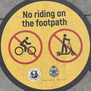 No riding on the footpath. And on the footbridge? The foreshore promenade? Gravel walkways? Dismount perhaps would’ve been sufficient?