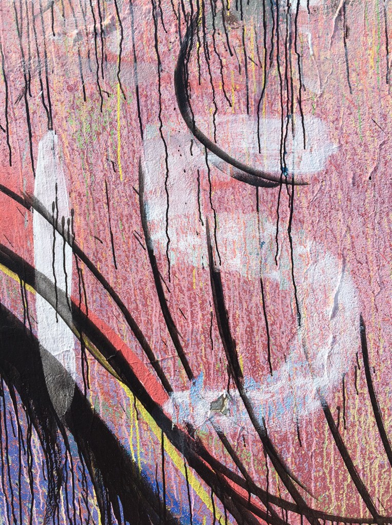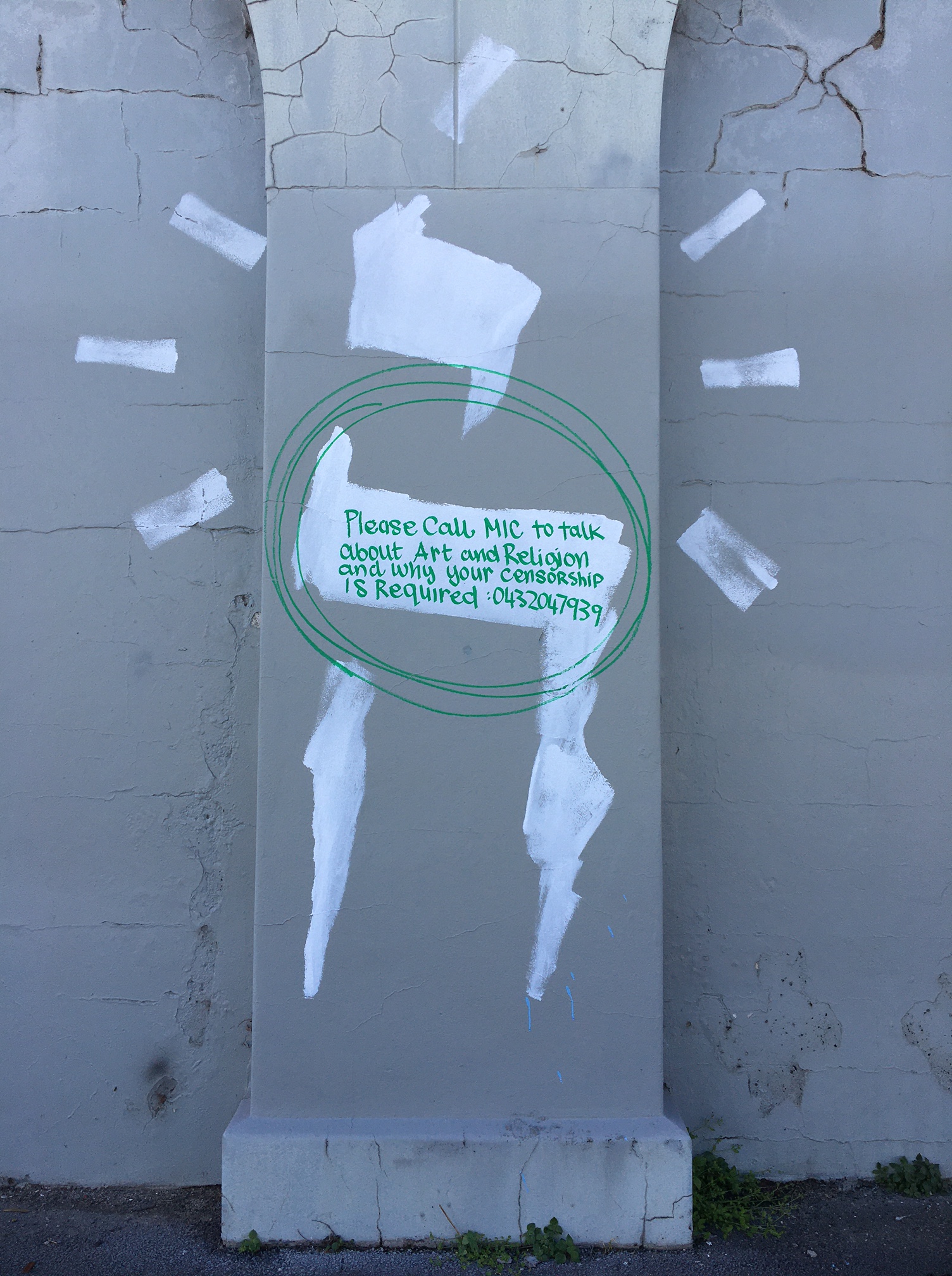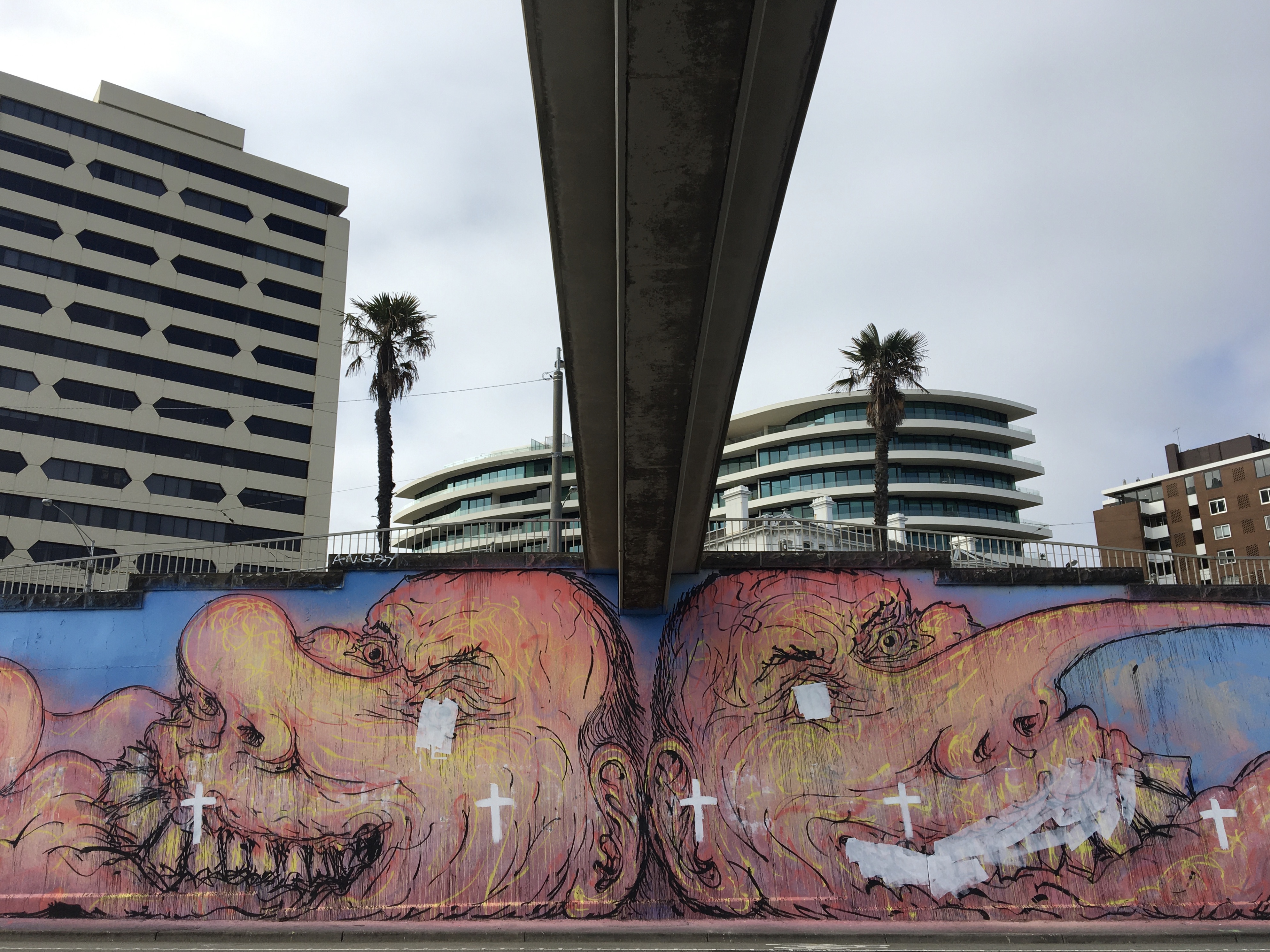 July 24, the wall is once again defaced, quite heavily. The “most confronting” bits of Mic’s mural have been roller-painted over, while a row of white crosses dotted the mural from one end of the wall to the other. Beneath one read, Mark 3:15.